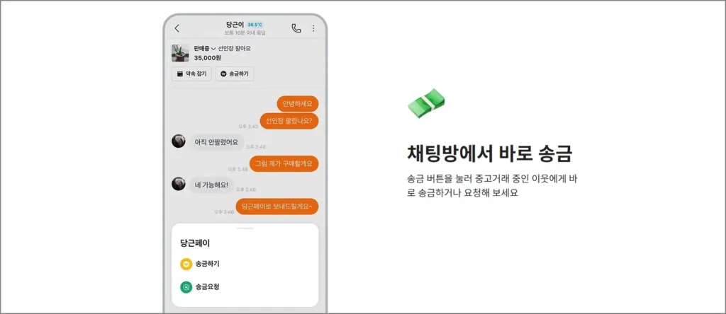 당근페이는 개인 간 중고거래에서 현금이나 외부 계좌이체를 대체하는 결제 수단입니다. 채팅방 내에서 바로 송금이 가능하며, 거래 내역이 자동으로 기록됩니다.