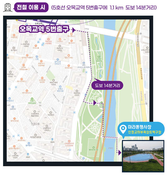 • 5호선 오목교역 5번 출구 → 도보 약 14분